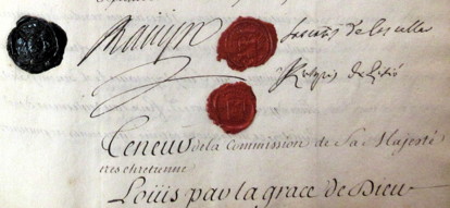 et celle qui vient du coté de Cezanne rester auPiemont. Clôture du procez verbal Et comme la presente contestation doit ètre décidée par les deux Roys, jl a été trouvé bon, entre nous commissaires du Roy tres chretien et de sa Majesté Sicilienne que les choses resteront sur le pied qu'elles sont jusqu'au reglement qui jnterviendra entre lesdites Majestés. En foy de quoy nous Commissaires du Roy Tres Chretien et sa Majesté Sicilienne en vertu de nos pouvoirs avons signé le present procez verbal et y avons fait aposer les cachets de nos armes. Fait a Briançon le dix septieme septembre mille sept cens quatorze. Signatures ![]() Teneur de la commission de Sa Majesté tres Chretienne Louis par la grace de Dieu page 27a