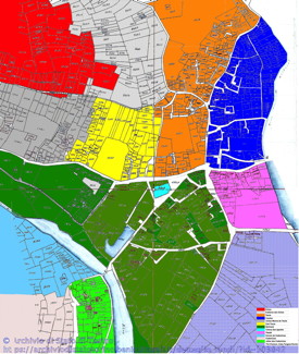 Tutti i quartieri hanno diversi "mas". La posizione dei quartieri e delle vinti nove "mas" è data in relazione alle quattro direzioni (bise e mezzogiorno, levante e ponente) e rispetto ai fiumi, rive, pendenze, cammini, ecc.