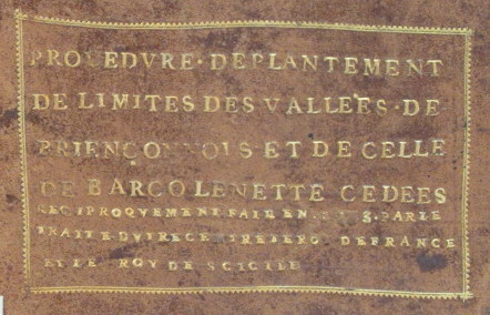 ni permettre qu'jl y soit contrevenù directementou jndirectement en foy de quoy nous avons signé ces presentes et a jcelles fait aposer notre sel secret Données à Nice ce deuxieme octobre mille sept cent treize Signé V. Amedo et plus bas de Sr Thomas et scellé Plein pouvoir de T.M. aux comtes et senateur Lascaris et intendant Ruschis pour en qualité de ses commissaires reconnoitre, regler convenir et marquer conjointement et amiablement avec celuy ou ceux qui seront deputés de la part de S.M.T.C. les limites entre les etats de T.M. en deça des monts et le Daufiné et entre la vallée de Barcelonne et le comté de Nice Conforme a l'original qui est resté entre nos mains. Lascaris de Castellar Rusquis de Lisio |