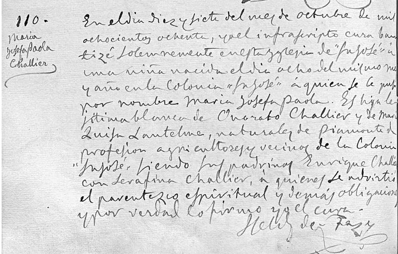 Maria Luisa Lantelme murió en la ciudad de San Salvador Entre Rios en Noviembre de 1930 a los 72 años, su hija Petrona la llevo a vivir con ella a esa ciudad. Su esposo Honorio falleció en Villa Elisa en Noviembre de 1941 a los 85 años.- Jorge Antonio fué el padre de Maria Margarita, nuestra tatarabuela, por ende, era el abuelo de Amadeo, nuestro bisabuelo. - Jorge Antonio en su segundo matrimonio fué el padre de Maria Luisa, quien era la mamá de Josefina Challier, nuestra bisabuela. Amadeo y Josefina son medios primos, no son medios primos hermanos dado no comparten padres ni madres, solo comparten el abuelo. 2.2.2 Hermanos de Amedeo ![]() De sus hermanos mayores que vinieron a la Argentina se encontró la siguiente información: • María Angélica se casó a los 24 años en 1882 con Francisco Silvano Guillaume (François Sylvain), quien es oriundo de Rochemolles nacido el 24/11/1853. Vivieron en San José donde nacieron sus hijos. ![]() • Giulio Alessio (Julio Alejo conocido como Alejo) se casó con Magdalena Follonier. Falleció en 1900. Se tiene registro de dos hijos, su primera hija Antonia del año 1892 quien falleció al nacer y Juan José nacido en 1893, sus padrinos de bautismo fueron María Angelica y Silvano su esposo. Juan José fue testigo en el acta de fallecimiento de Amadeo. Se casó con Catalina Regina Fus en 1915, él tenia 22 años y ella 16 años. Vivieron en Colonia Pantanoso cerca de Villa Elisa. Actualmente la mayoría de los descendientes de esta familia viven en Villa Elisa, San José y Buenos Aires. Ramón vivía en Villaguay, Omar fué el último de los hijos de Juan José. Amaranto es el papá de Daniela y vivía en San José. Edelma vive en Villa Elisa y es hija de Angel Amadeo. Catalina falleció en febrero de 1984 y sus restos descansa en Villa Elisa. ![]() • Antonio casado con Josefina Ramat en 1887. Vivían en Colonia Hughes/Colonia Nueva. Josefina falleció a los 35 años en Junio de 1905. Antonio falleció a los 67 años en 1929 en San José y el testigo fue su sobrino Juan Bautista quien estaba domiciliado en Colonia Jubileo en ese entonces. Se volvió a casar con Antonia Bornou, no se tiene al momento la información correcta de este segundo matrimonio. La mayoría de sus hijos fallecieron muy jóvenes, Gabriel falleció a los 30 días de tétano, Cecilia Margarita con 22 años y Ernesto en Noviembre 1927 a los 28 años y Daniel Nemesio al año de edad de gastroneteritis. Todos figuran sepultados en el cementerio de San José. Constanza Lantelme de Guillaume falleció en Octubre de 1970 a los 73 años. ![]() • Maria Francisca nacida en 1874 en San José. Casada con Juan B. Follonier de Suiza. Falleció en 1917 con 43 años de tuberculosis pulmonar en colonia Caseros. Según registros, fue la primera hija nacida en Argentina. ![]() • Juan Bautista nació en 1881 en San José. Casado en 1900 con Maria Angela Challier, hermana de la esposa de Amadeo, ella tenía 18 años cuando se casó. Tuvieron 12 hijos. Vivieron en Villaguay donde nacieron algunos hijos para luego irse a San Salvador. Jacinto es el papá de Graciela Lantelme de San Salvador. Juan Bautista -Hijo- se casó con Hortencia Siegrist, prima de Ercilia Siegrist, y tuvieron a Jorge Lantelme quién fue muy cercano a nuestros padres. ![]() - 2.3 Abuelos : Irineo Teodoro Lantelme - 2.4 Otros Lantelme que vinieron a Entre Ríos - 2.5 ¿Quiénes me ayudaron? |